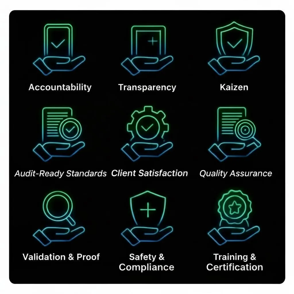 We're the only cleaning company with a "Proof-First" model that combines 24-hour fix-or-credit guarantees, photo-logged checklists, dedicated account managers, direct employees (never subcontractors), and zero long-term lock-ins—so you never chase updates or wonder if the work got done.