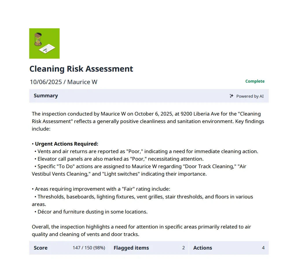Monthly Cleanliness Risk Assessment. Issues fixed in 24 hours or you get a credit documented, no debate.